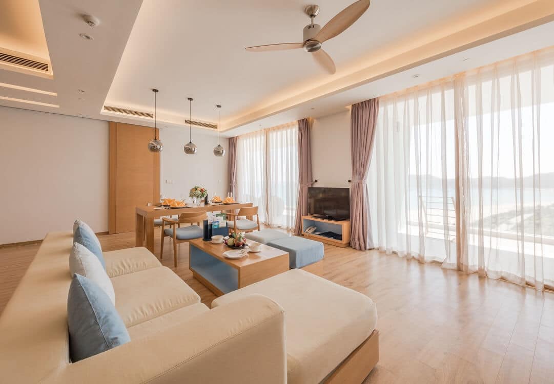 Điểm cộng của hạng phòng này là không gian rộng rãi, bố trí giường đôi và giường đơn hợp lý, đi kèm với khu vực sinh hoạt chung. Một số phòng còn có ban công riêng với tầm nhìn hướng biển tuyệt đẹp. Đây là sự lựa chọn hoàn hảo nếu bạn đi cùng trẻ nhỏ hoặc người lớn tuổi.